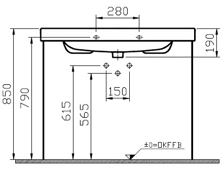 Ausladung 450 mm, Höhe 190 mm, mit Überlauf, 1 Hahnloch hinten mittig durchgestochen, Unterseite geschliffen, Montage auf Waschtischplatte wandbefestigt, Aufsatzhöhe ca. 100 mm
