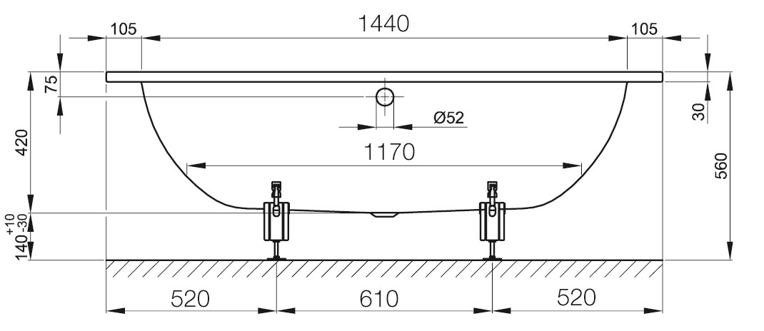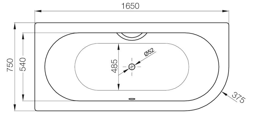 Ablaufloch 52 mm Mitte mittig, verlängerte Ablaufgarnitur nötig