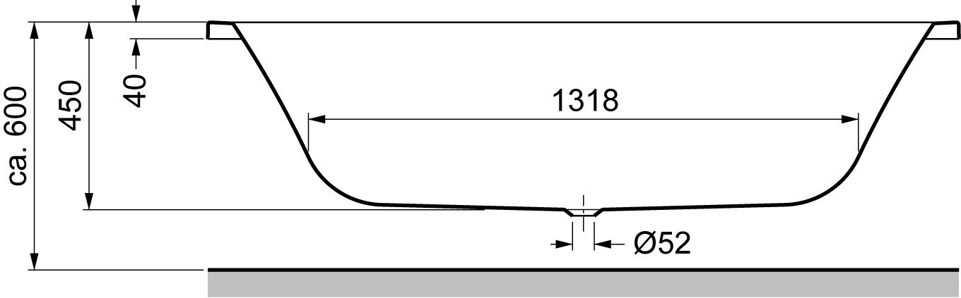 Ablaufloch 52 mm Mitte mittig, verlängerte Ablaufgarnitur nötig