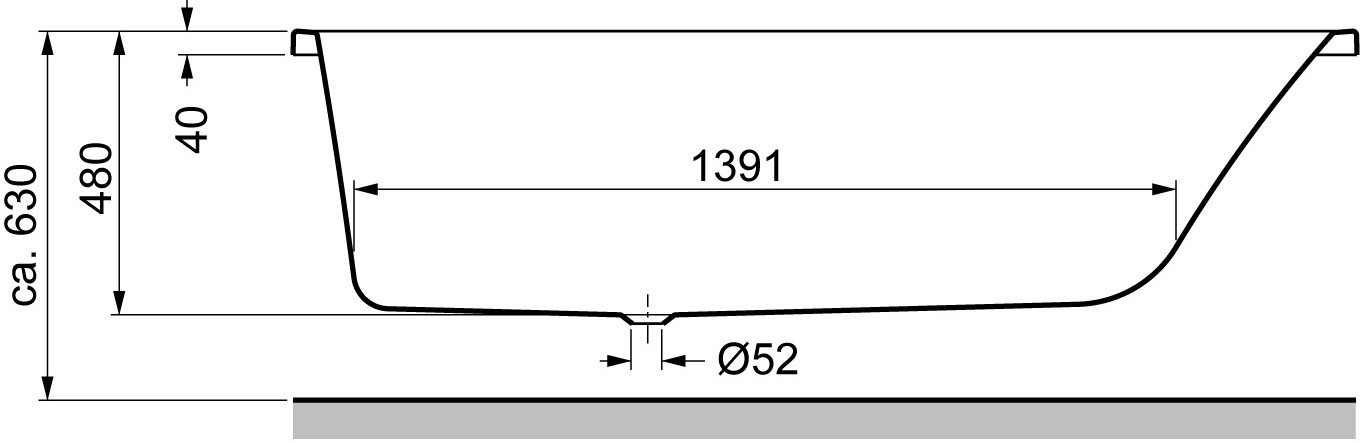 Ablaufloch 52 mm Fussteil mittig, verlängerte Ablaufgarnitur nötig