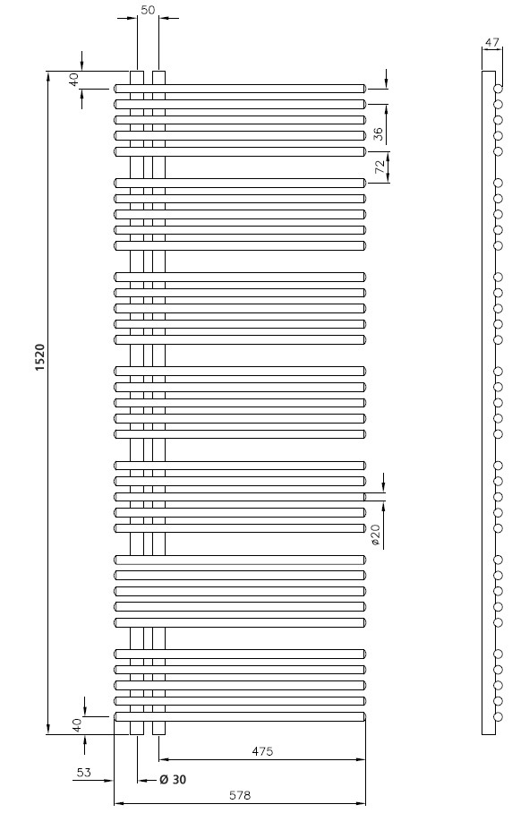 Rohrabstände 36 mm, Blockabstände 72 mm