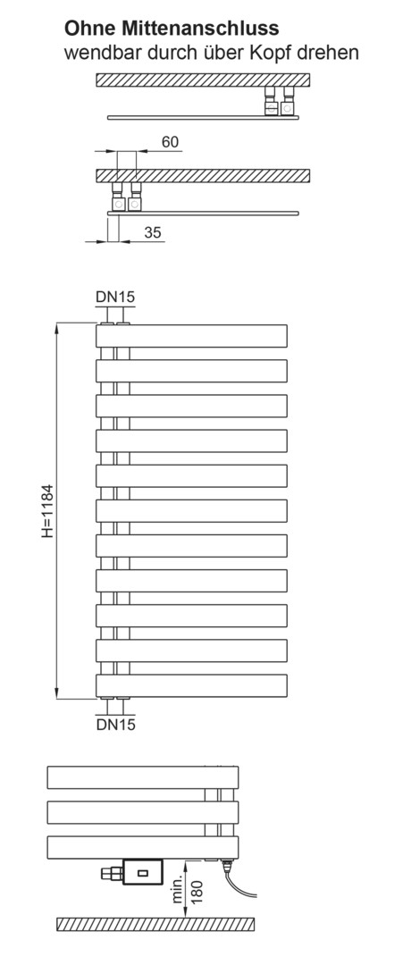 Badheizkörper vorgefüllt Optima L [2] E H1184xB600xT52, Platinum
