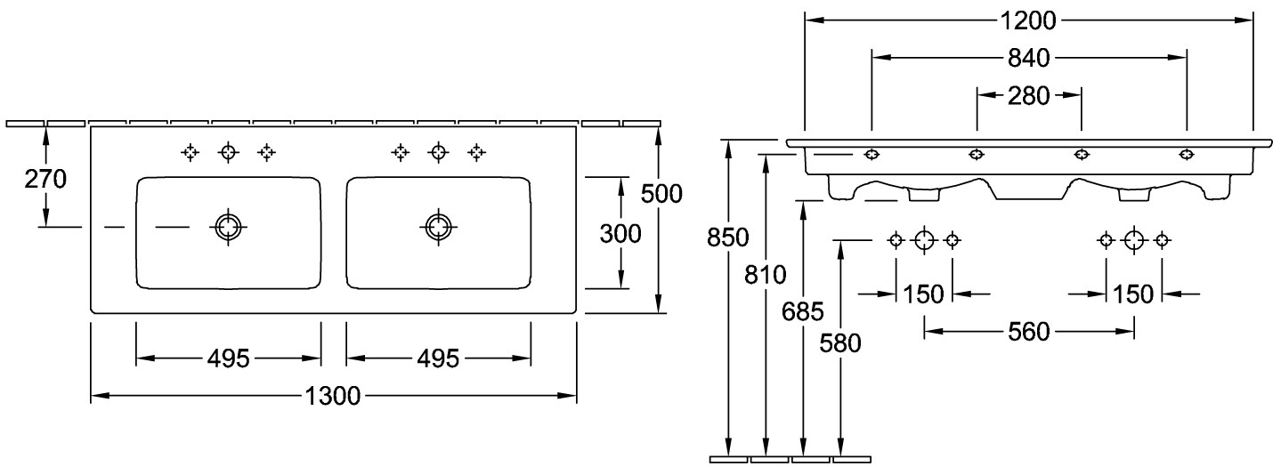 Doppel-Waschtisch V&B VENTICELLO 4111.DJ 1300x500mm, o.HL, m.ÜL, weiss