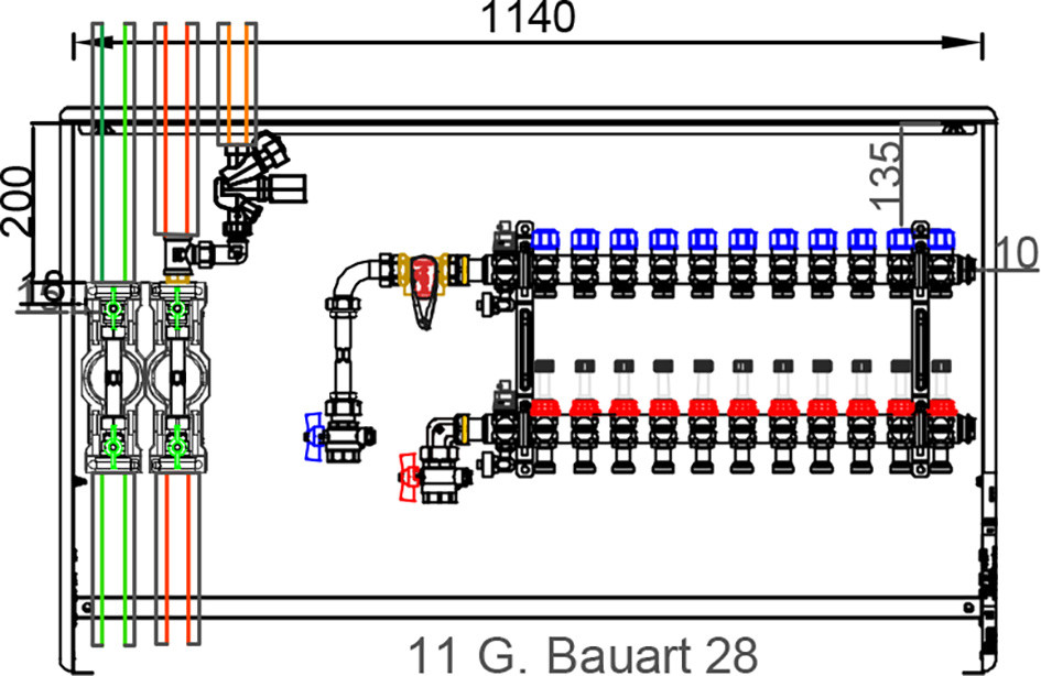 Fussbodenverteilerstation 11-fach m.WMZ KW/WW li, Multith. innen, VR durchgehend