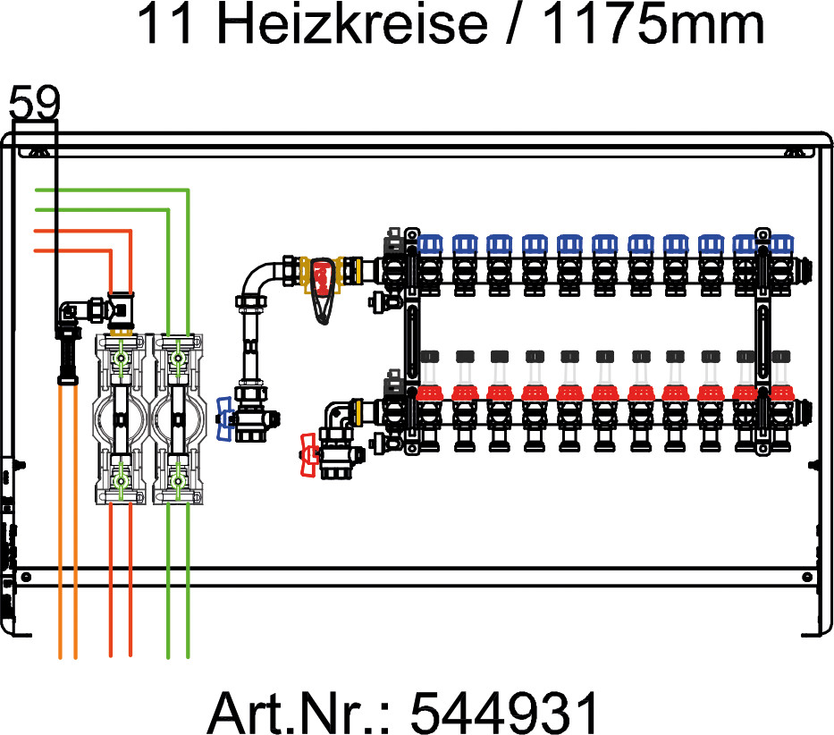 Fussbodenverteilerstation 11-fach m.WMZ KW/WW links, Inl.-Setter, VR n. im Kast.