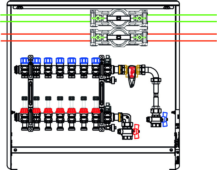 Fussbodenverteilerstation 12-fach m.WMZ KW/WW oben, o. Zirk., Anschluss rechts