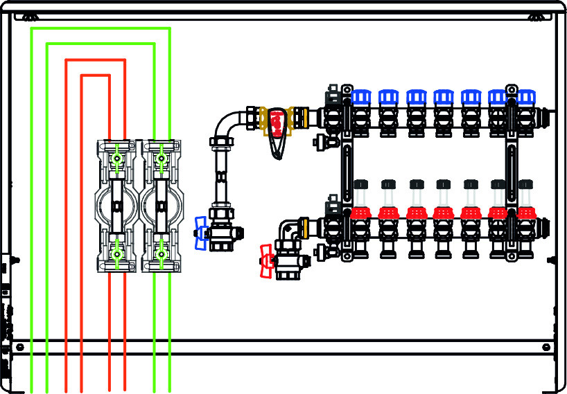 Fussbodenverteilerstation 2-fach m. WMZ KW/WW links, o. Zirk., VR im Kast.
