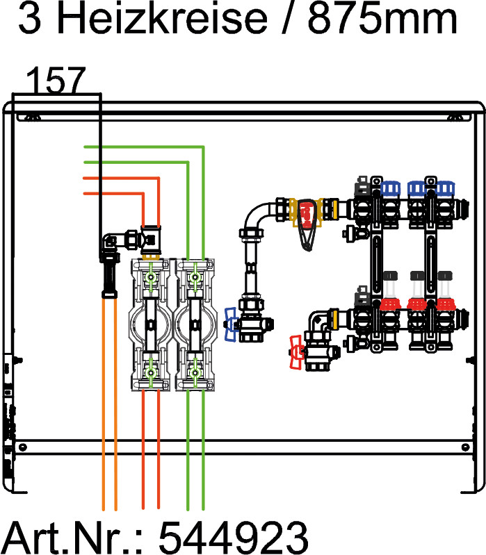 Fussbodenverteilerstation 3-fach m. WMZ KW/WW links, Inl.-Setter, VR n. im Kast. 544923