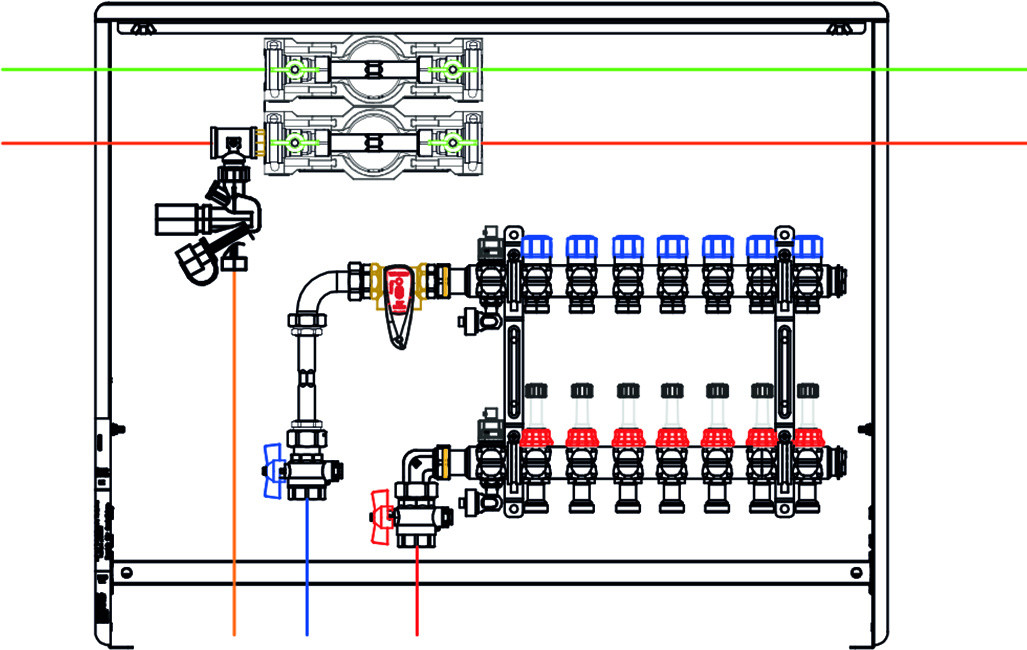 Fussbodenverteilerstation 6-fach m. WMZ KW/WW oben, Multitherm, Anschluss rechts 544822