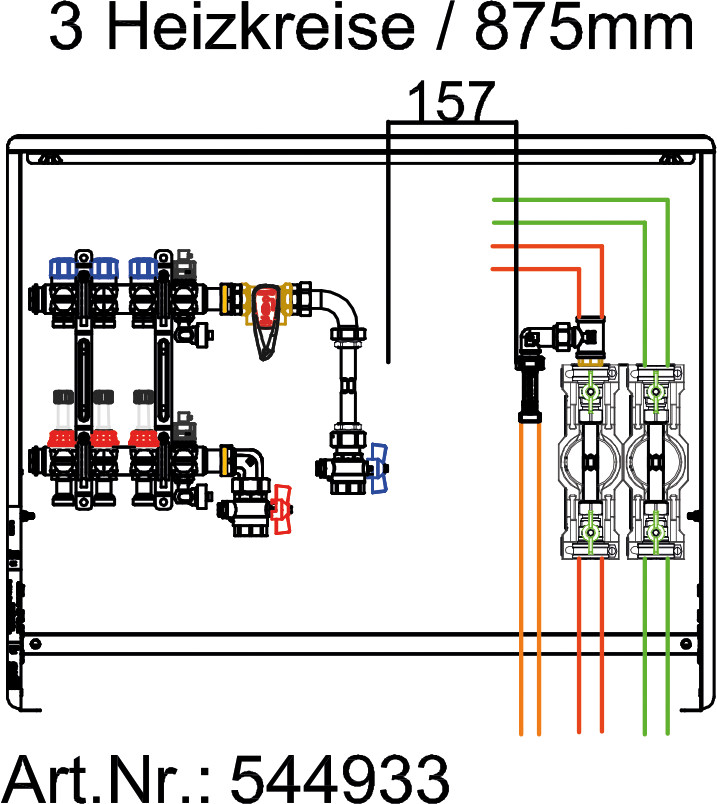 Fussbodenverteilerstation 3-fach m. WMZ KW/WW rechts, Inl.-Setter, VR n. im Kast 544933
