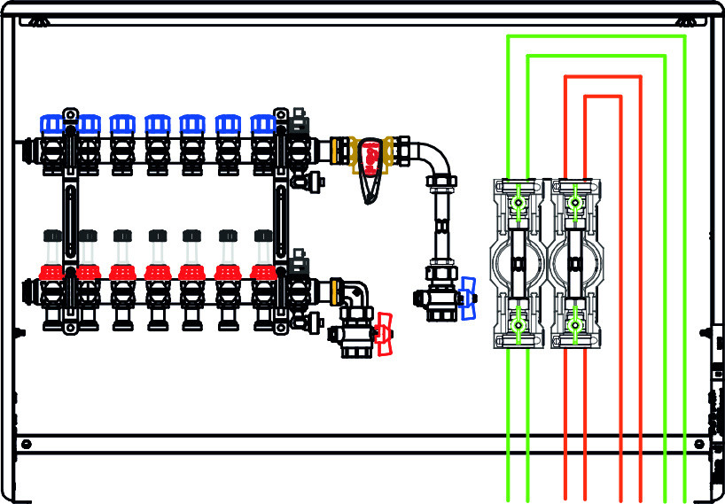 Fussbodenverteilerstation 2-fach m. WMZ KW/WW rechts, o. Zirk., VR im Kast. 549302
