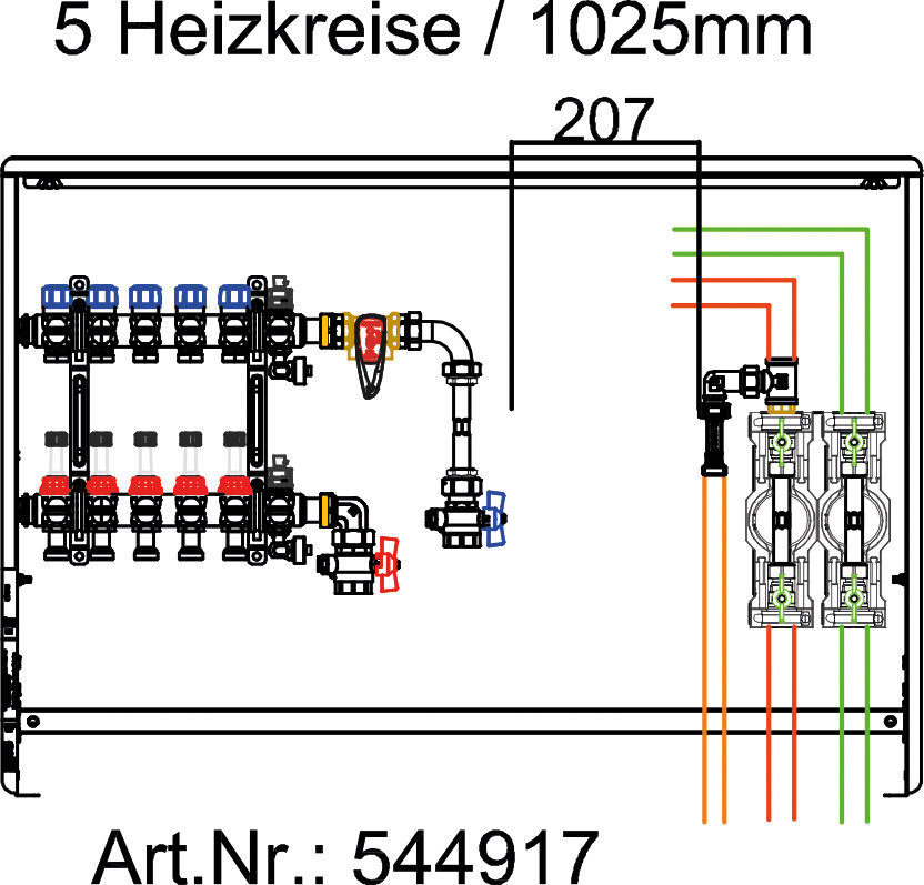 Fussbodenverteilerstation 5-fach m. WMZ KW/WW rechts, Inline-Setter, VR im Kast. 544917