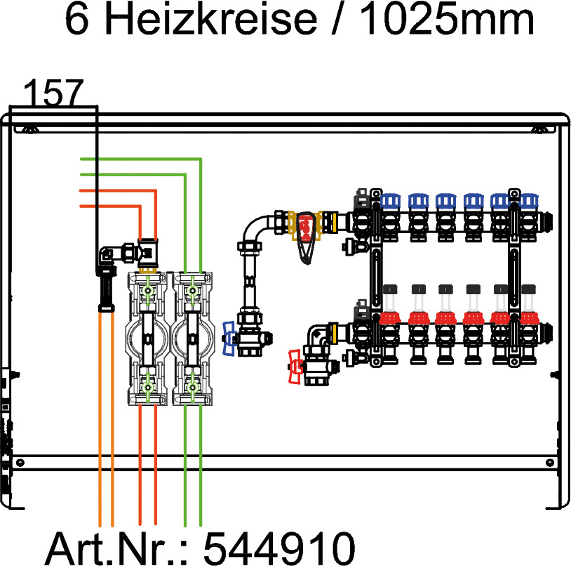Fussbodenverteilerstation 6-fach m. WMZ KW/WW links, Inline-Setter, VR im Kast. 544910