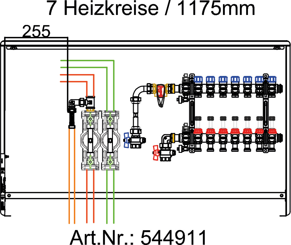Fussbodenverteilerstation 7-fach m. WMZ KW/WW links, Inline-Setter, VR im Kast.