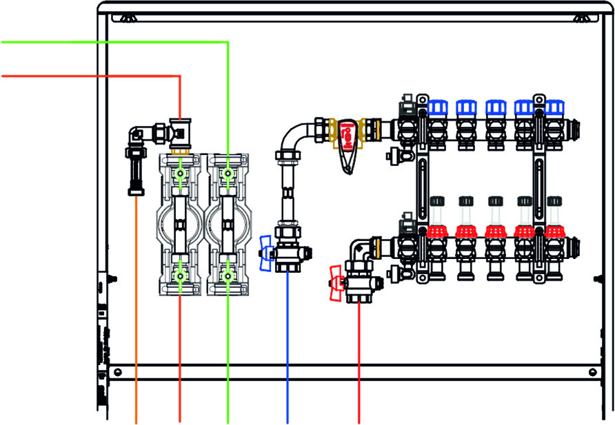 Fussbodenverteilerstation 5-fach m. WMZ KW/WW rechts, Inl.-Setter, VR n. im Kast 544935