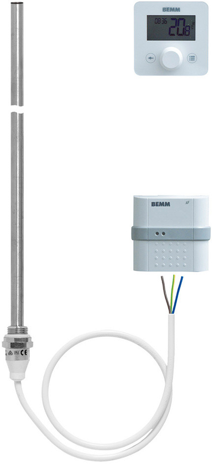 mit Funk Raumregelung Komfort A, bestehend aus Elektroheizstab mit PTC-Element, IP55, Klasse I, mit ca. 1.0 m Anschlusskabel und Funk Empfänger, zur Montage und Anschluss auf UP-Dose, Klasse II, 230VAC, max. Schaltleistung 16 A, IP20, Gehäuse weiss, Masse B87xH87xT20 mm, sowie Funk-Uhrenraumthermostat, digital mit Wochenprogrammierung, 3 voreingestellten und einem individuell programmierbaren Programm, Ferien- und Frostschutzfunktion, Tastensperre, Funktion geöffnetes Fenster, Einstellbereich +0.5 bis +30°C, IP30, inkl. 2 Batterien Typ AAA LR03 1.5 V, Gehäuse weiss, Masse B85xH85xT32.4 mm.