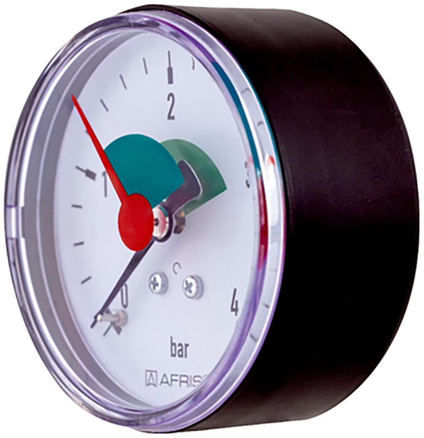 mit grünem Feld von 1.5 bis 3 bar, verstellbarem roten Markenzeiger mit grüner Fahne, Rohrfeder Kupferlegierung, Sichtscheibe Kunststoff