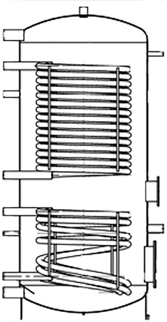 mit 2 grossen doppelt gewickelten Glattrohr-Heizregister, aus Qualitätsstahl S275JR, emailliert nach DIN 4753