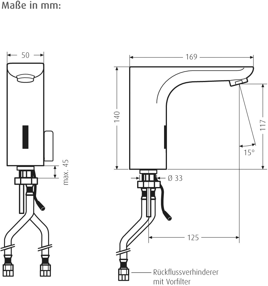 Netzbetrieb, berührungslose Betätigung, Auslauf starr, Ausladung 125 mm, Gesamthöhe 140 mm, Perlator schräg 15°, Höhe Perlatormitte 117 mm
