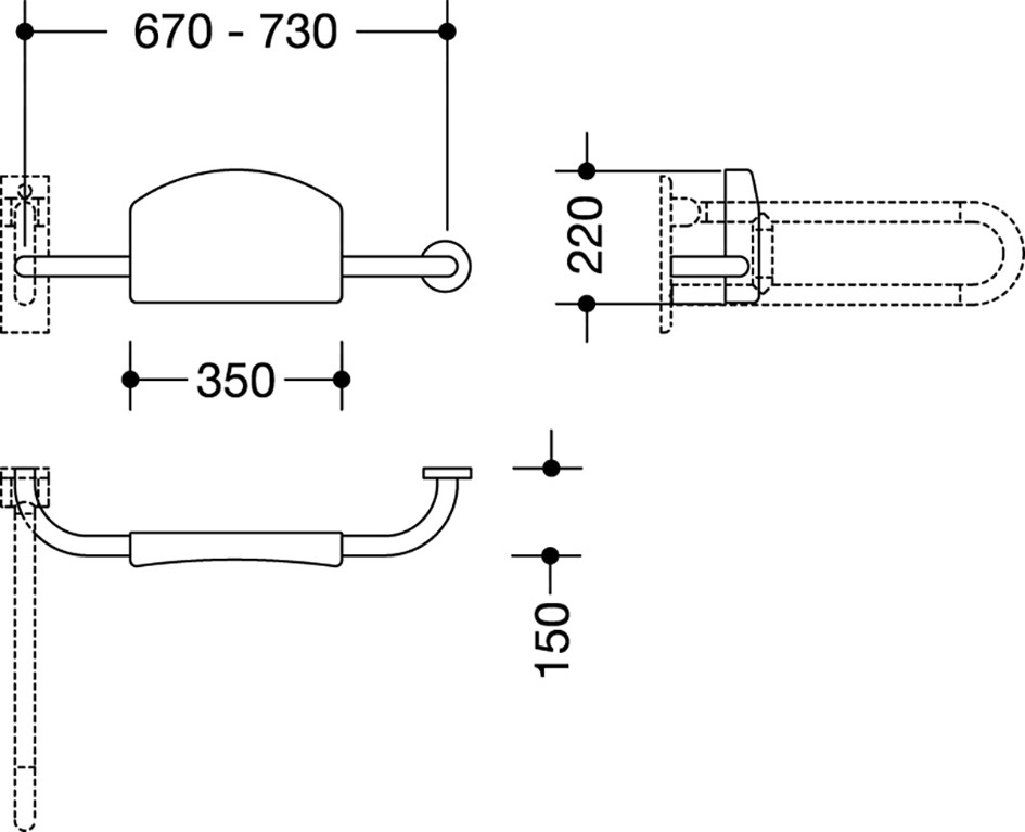 rechts zur Montage an Stützklappgriff, links zur Montage mit Wandrosette D 70 mm, Ausladung 150 mm, AD 670-730 verstellbar, Rückenpolster Breite 350 mm, Höhe 220 mm PU-Integralschaum schwarz, oben gebogen, Stange D 33 mm, OHNE Befestigungsmaterial BM1x.2.1, OHNE Stützklappgriff