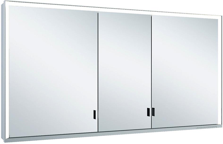 3 Türen innen und aussen verspiegelt, Wandvorbau, Korpus silber gebeizt eloxiert, 3x 2 Glasfachboden verstellbar, Rahmenbeleuchtung und Waschtisch-/ Fachbeleuchtung, 2700 K (warmweiss) - 6500 K Tageslicht, LED 68 W, sufenlos dimmbar, 2 CH-Steckdosen innen, Touch-Sensorik, EEK: A++, A+, A, 68 kWh/1000h