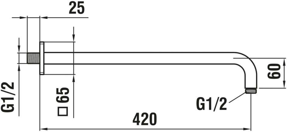Ausladung 420 mm, Rohr rund, vorne gebogen, Abgangshöhe -60 mm, Brauseabgang 1/2''AG, Rosette eckig, 80x80 mm.