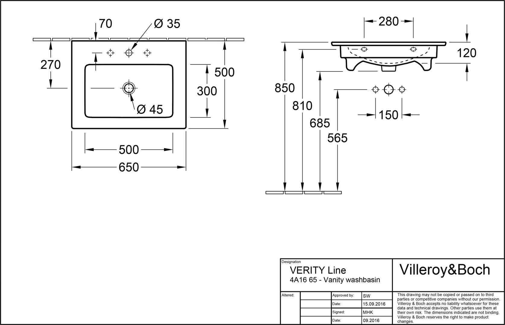 Waschtisch SMARAGD VERITY LINE 4A16.65 650x500mm, m.HL, m.ÜL, weiss