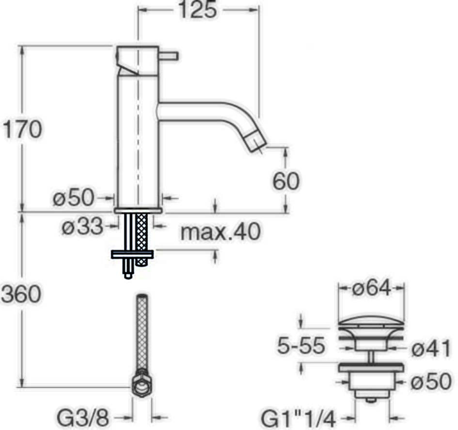 Auslauf starr, nach vorne gebogen, Gesamthöhe 170 mm, Perlator schräg, Höhe Perlatormitte 59 mm, Pin für Griffhebel immer in Länge 20 mm und Länge 40 mm beiliegend, gewünschte Länge bei Montage verwenden - Rücknahme nicht verwendeter Pins nicht möglich, Anschlussschläuche Rohrstutzen 10 mm