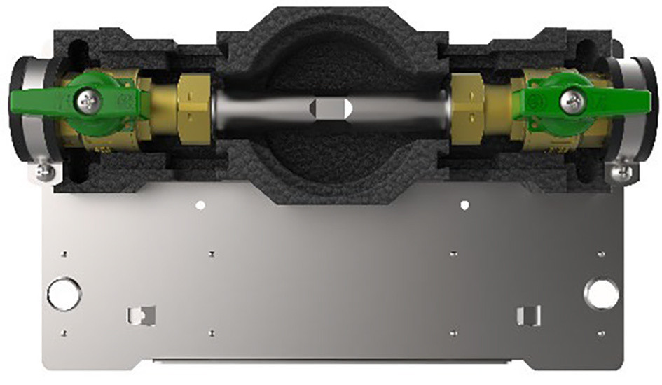 je ein 3/4'' Wasserzähler-Kugelhahn mit grünem Flügelgriff vor und nach dem 3/4'' Wasserzähler-Passstück.
