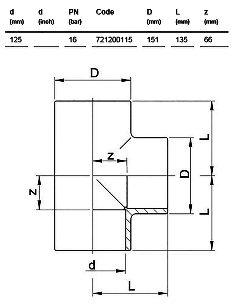 T-Stück 90°, egal PVC-U PN16, D 125 mm