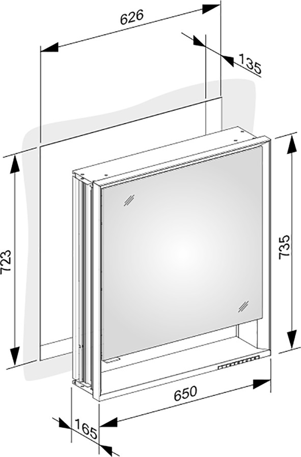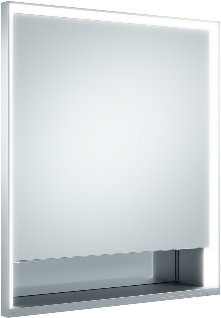1 Tür innen und aussen verspiegelt, Wandeinbau, Anschlag links, Korpus silber gebeizt eloxiert, 2 Glasfachboden verstellbar, Rahmenbeleuchtung und Waschtisch-/ Fachbeleuchtung, 2700 K (warmweiss) - 6500 K Tageslicht, LED 54 W, stufenlos dimmbar, 1 Steckdose innen, Touch-Sensorik, EEK: A++, A+, A, 54 kWh/1000h
