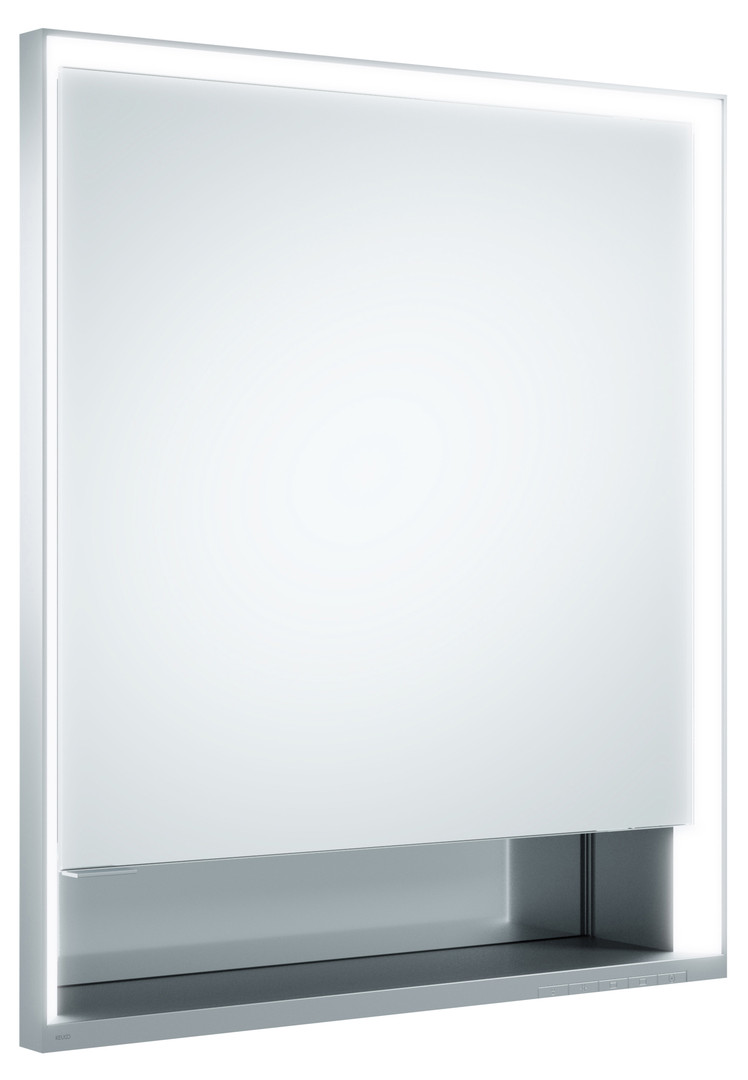 1 Tür innen und aussen verspiegelt, Wandeinbau, Anschlag links, Korpus silber gebeizt eloxiert, 2 Glasfachboden verstellbar, Rahmenbeleuchtung und Waschtisch-/ Fachbeleuchtung, 2700 K (warmweiss) - 6500 K Tageslicht, LED 54 W, stufenlos dimmbar, 1 Steckdose innen, Touch-Sensorik, EEK: A++, A+, A, 54 kWh/1000h